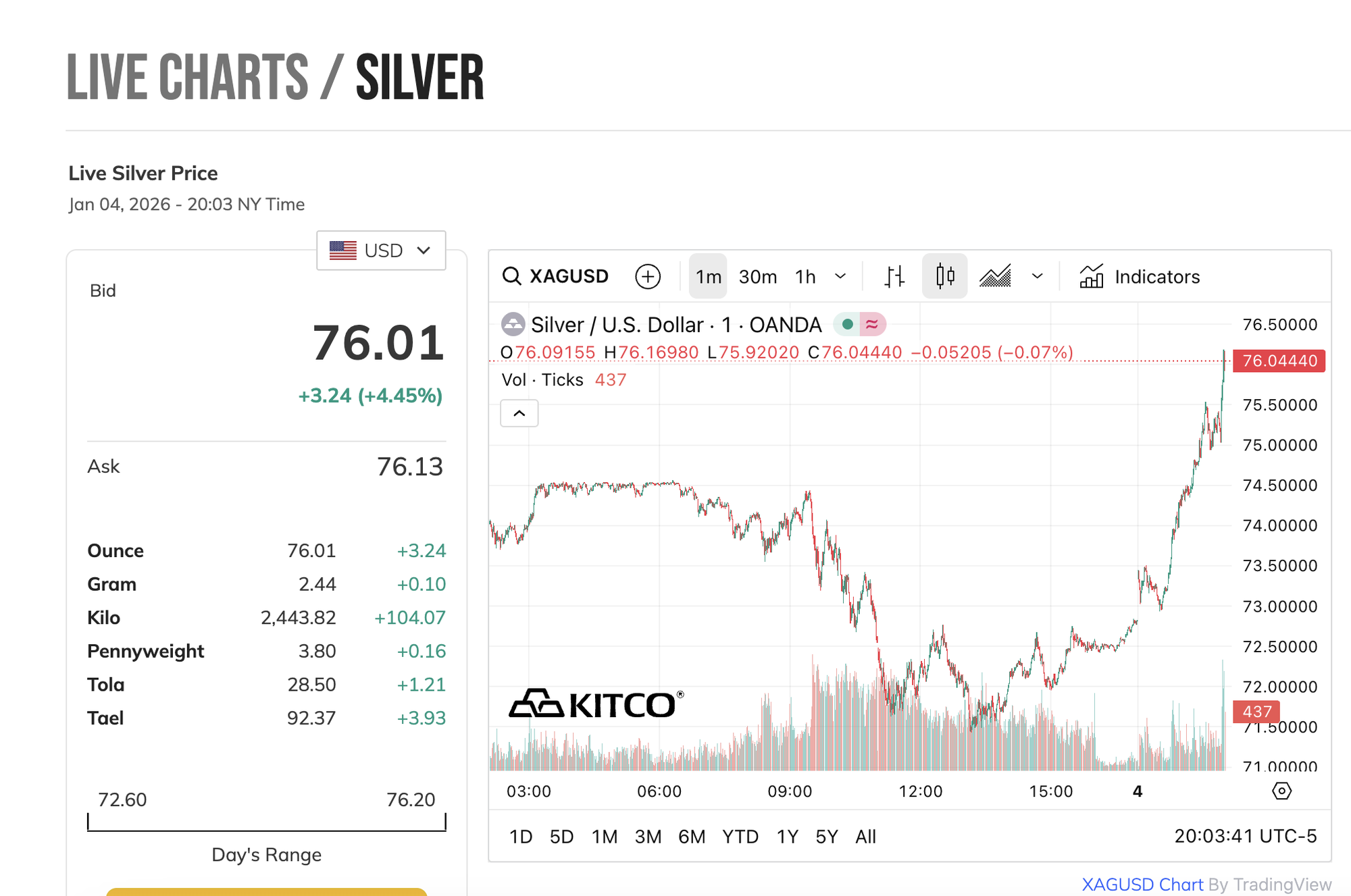 Sáng 5-1, ngay khi mở cửa giao dịch tuần mới, giá bạc hôm nay trên thị trường quốc tế đi lên mạnh mẽ, vượt 76 USD/ounce, tăng tới 4,45% so với phiên cuối tuần.
