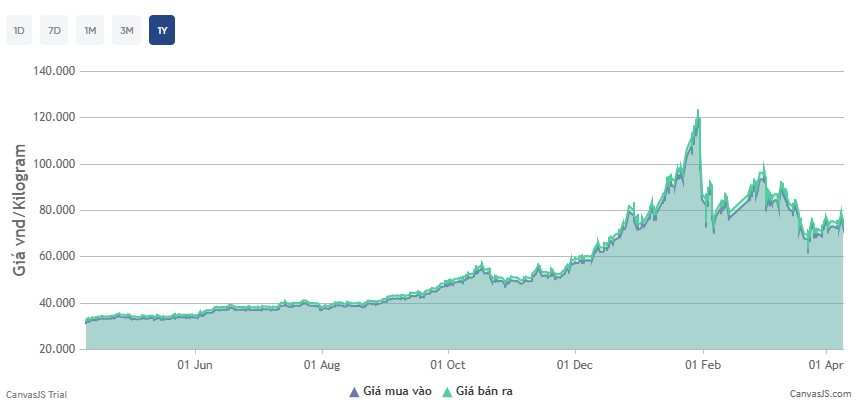 Giá bạc thỏi giảm mạnh 4 triệu đồng/kg so với mức đỉnh phiên hôm qua. Trước đó, việc Mỹ và Iran thỏa thuận ngừng bắn vào ngày 7/4 đã giúp giá bạc trong nước tăng vọt và vượt mốc quan trọng 80 triệu đồng/kg, tuy nhiên sự không ổn định của eo biển Hormuz đã khiến giá bạc sụt giảm trở lại.