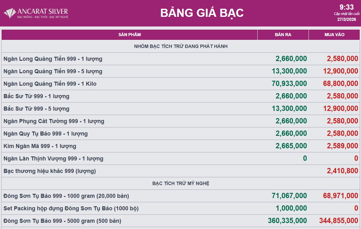Trong khi đó, loại bạc thỏi 999 1kg có giá 68.800.000 đồng/thỏi (mua vào) và 70.933.000 đồng/thỏi (bán ra), cập nhật lúc 9:33 ngày 27/3.