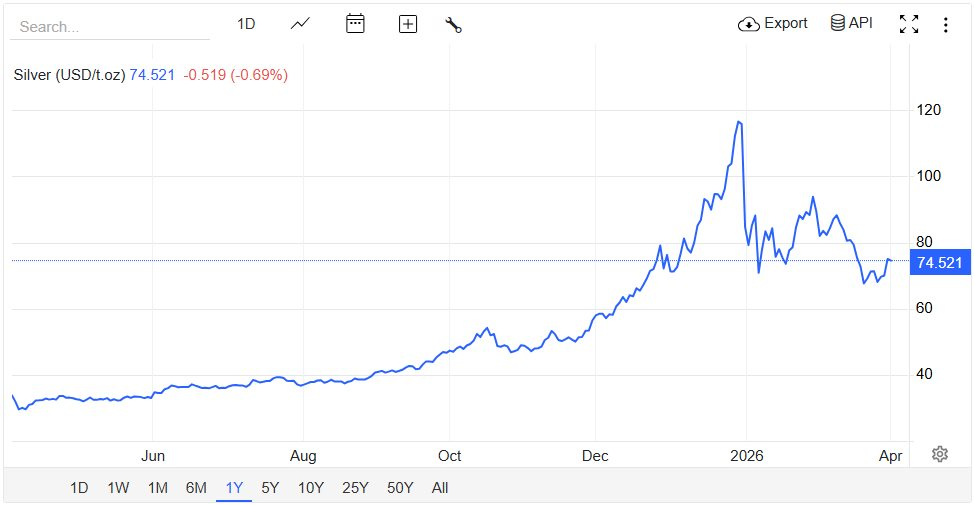 Dù vậy, cần lưu ý rằng đà tăng hiện tại chỉ mang tính phục hồi kỹ thuật sau cú giảm sâu trước đó. Trong tháng 3, giá bạc đã lao dốc hơn 20% – mức giảm mạnh nhất kể từ tháng 9/2011. So với đỉnh thiết lập hồi tháng 1, giá bạc hiện vẫn thấp hơn gần 40%.