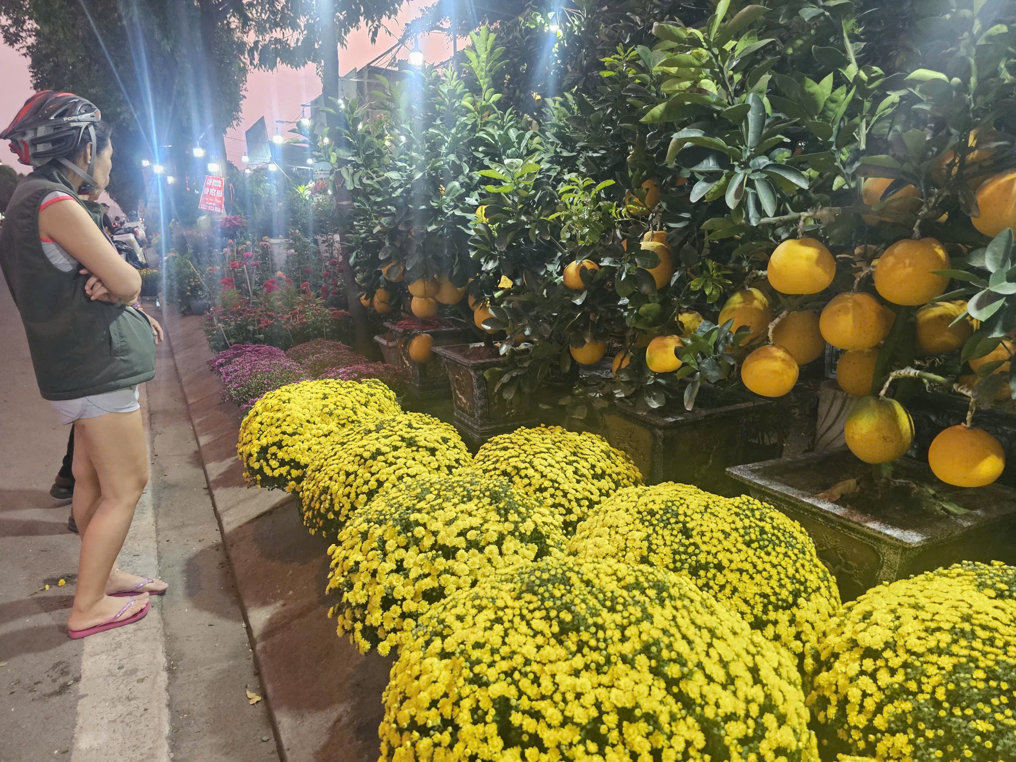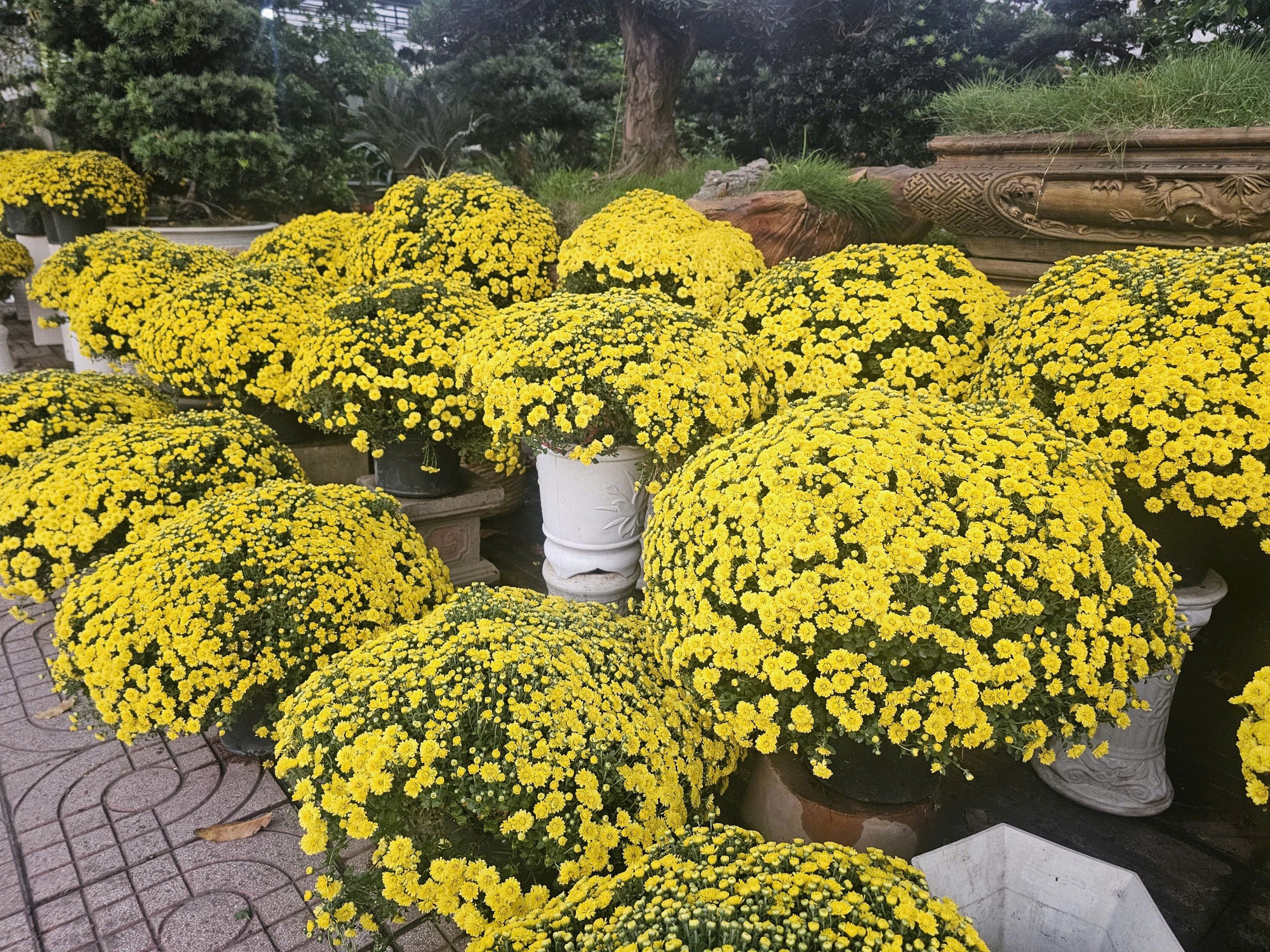 Trong khi đó, tại nhiều tuyến đường khác ở TPHCM như Nguyễn Hoàng, Lương Định Của hay Nguyễn Hữu Thọ, các vườn hoa kiểng đã bắt đầu nhập cúc mâm xôi với số lượng lớn, lên đến hàng trăm chậu để bán Tết, nở vàng rực, thu hút sự quan tâm của người mua.