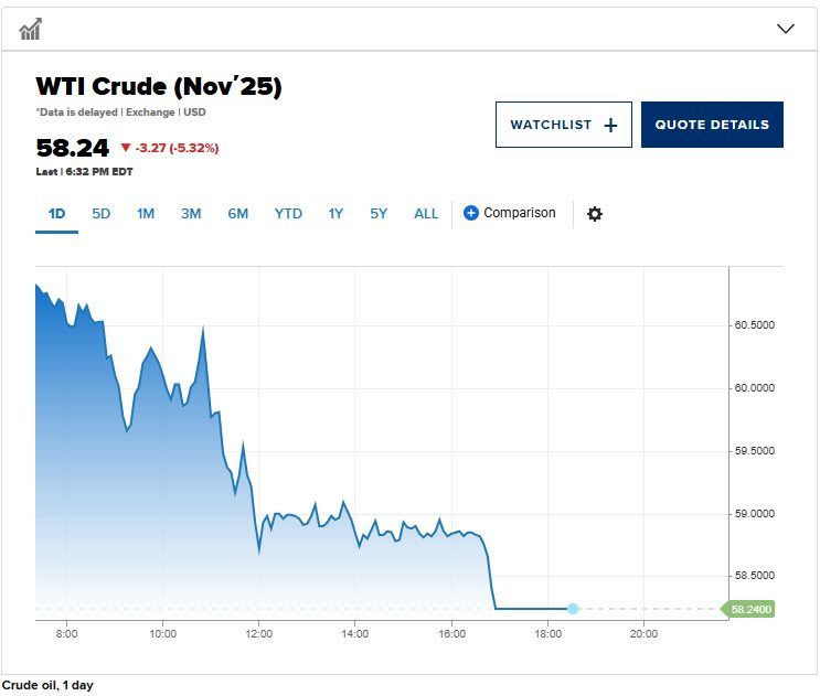 Theo dữ liệu mới nhất, giá dầu WTI giao tháng 11/2025 giảm thêm xuống 58,24 USD/thùng, tương đương mức giảm 5,32% vào lúc 6:32 chiều (giờ EDT).
