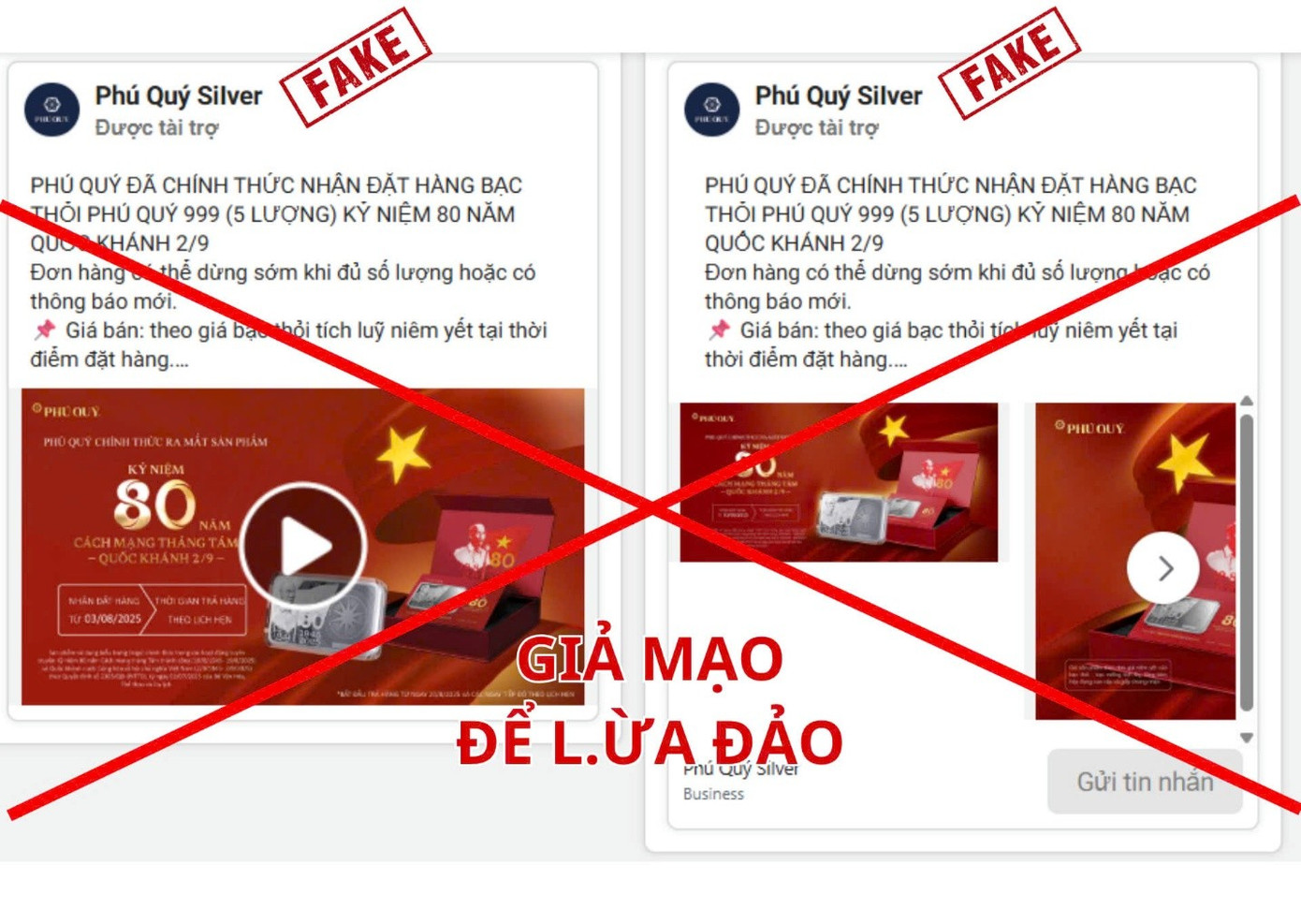 Ngày 7/8, Tập đoàn Vàng bạc Đá quý Phú Quý phát đi cảnh báo chính thức về việc xuất hiện Fanpage giả mạo thương hiệu Phú Quý. Cụ thể là trang có tên "Phú Quý Silver" mang dấu tích xanh, giao diện giống hệt Fanpage chính thức của Tập đoàn vàng bạc đá quý Phú Quý được lập ra nhằm lừa đảo khách hàng chuyển tiền đặt mua sản phẩm Bạc thỏi kỷ niệm 80 năm Quốc khánh 2/9.