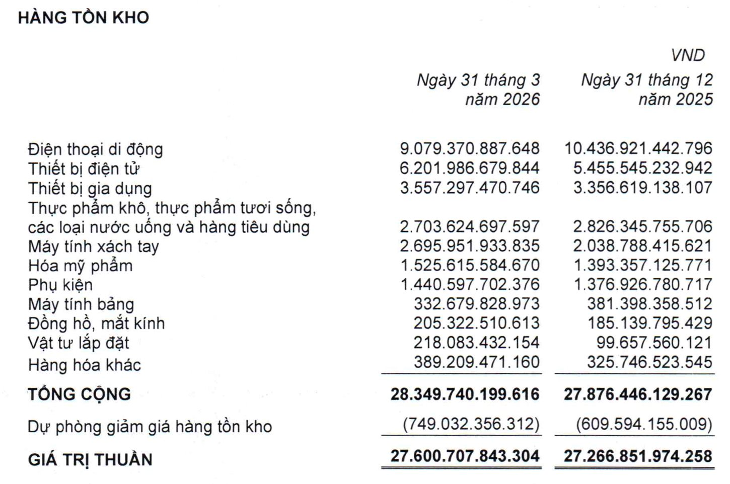 Theo BCTC quý 1/2026, CTCP Đầu tư Thế Giới Di Động ghi nhận giá trị hàng tồn kho (sau khi trích lập dự phòng) tăng gần 300 tỷ so với đầu năm lên mức 27.600 tỷ đồng, chiếm gần 1/3 tổng tài sản tại ngày 31/3. Trong đó, điện thoại di động, thiết bị điện tử, máy tính xách tay, máy tính bảng chiếm hơn 18.300 tỷ đồng.