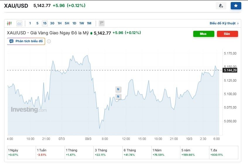 Trên Investing.com, giá vàng đã hồi phục nhẹ về ngưỡng 5.142,77 USD/ounce.