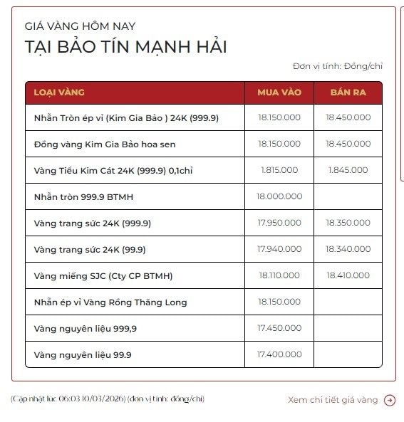 Tương tự, giá vàng nhẫn Kim Gia Bảo 24K (999.9) của Bảo Tín Mạnh Hải niêm yết ở mức 181,5 triệu đồng/lượng (mua vào) và 184,5 triệu đồng/lượng (bán ra), giảm khoảng 500.000 đồng/lượng so với ngày hôm qua.