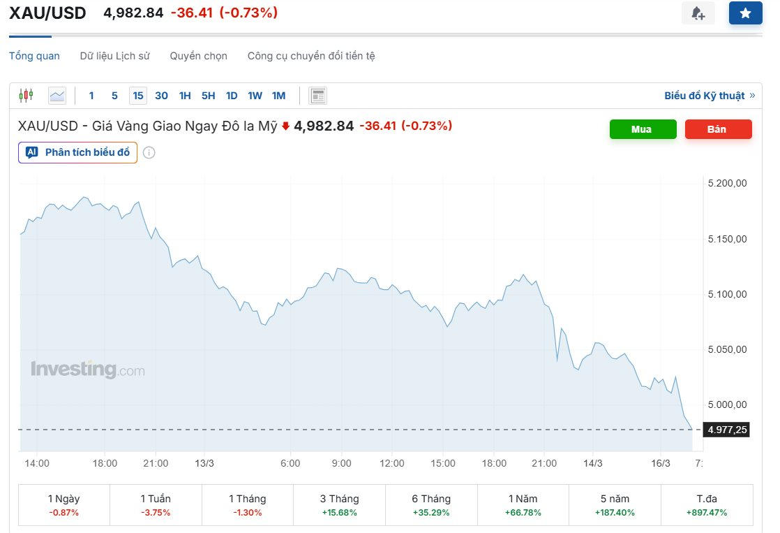 Sáng 16/3 theo giờ Việt Nam, giá vàng giao ngay trên thị trường quốc tế đã xuống dưới mốc 5.000 USD/ounce, giao dịch ở mức 4.982 USD/ounce. Đây là kết quả của một tuần giao dịch đầy biến động khi có thời điểm kim loại quý này đã chạm tới vùng 5.240 USD/ounce nhưng không thể duy trì đà tăng lâu dài. Sự suy yếu này diễn ra trong bối cảnh nhà đầu tư đang có xu hướng ưu tiên nắm giữ đồng USD như một tài sản thanh khoản cao nhất trong giai đoạn bất ổn tài chính toàn cầu.