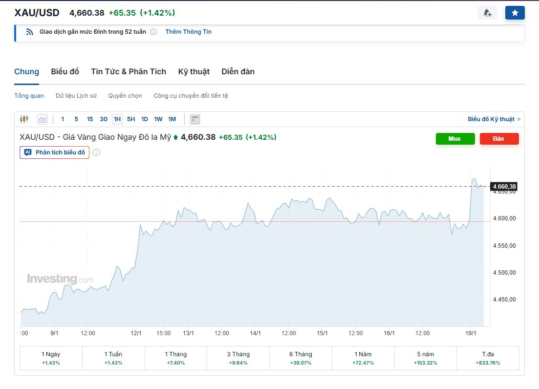 Mở đầu tuần giao dịch vào ngày 11/1/2026, giá vàng thế giới đứng ở mức khoảng 4.510 USD/ounce. Tuy nhiên, chỉ trong vòng 24 giờ sau đó, thị trường đã chứng kiến một cú nhảy vọt đáng kinh ngạc.