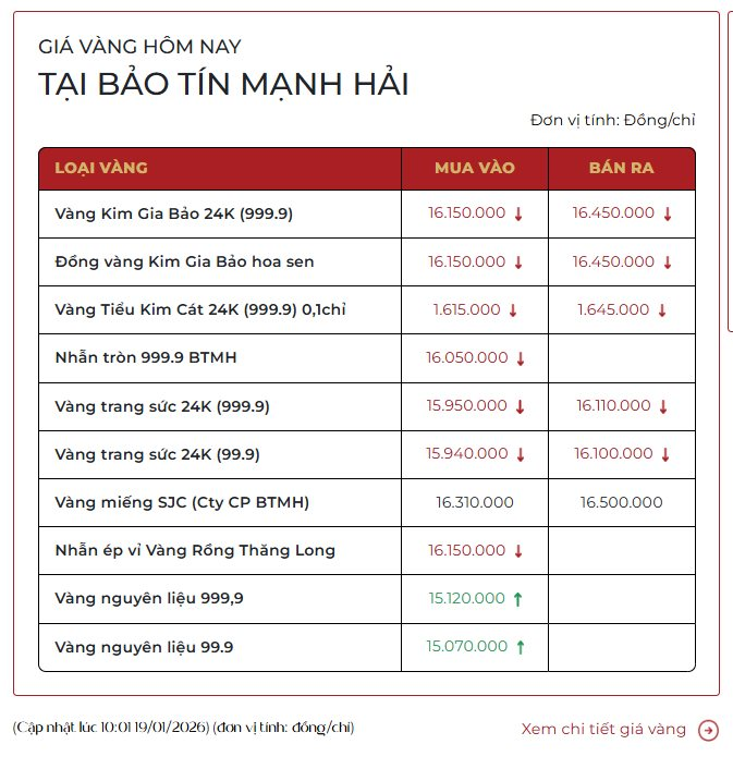 Tính đến sáng ngày 19/1/2026, giá vàng nhẫn Kim Gia Bảo của Bảo Tín Mạnh Hải có giá mua vài 161,5 triệu đồng/lượng và bán ra 164,5 triệu đồng/lượng.