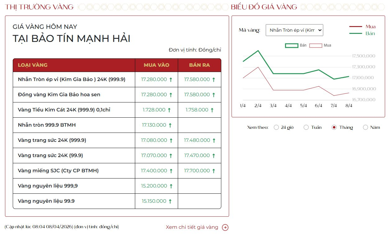 Thị trường kim loại quý trong nước và thế giới đang chứng kiến những biến động cực kỳ mạnh mẽ trong phiên giao dịch ngày hôm nay, 08/04/2026. Ghi nhận thực tế cho thấy, giá vàng tại các đơn vị lớn như SJC, Doji, Phú Quý và Bảo Tín Mạnh Hải đồng loạt bật tăng "phi mã", phá vỡ nhiều mốc kháng cự quan trọng. Nhìn chung, mặt bằng giá vàng trong nước hôm nay đã tăng trung bình từ 1,5% đến 2% chỉ sau một đêm.