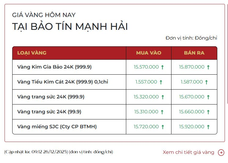 Trong khi đó, vàng nhẫn trơn 9999 cũng ghi nhận xu hướng đi ngang hoặc giảm nhẹ, duy trì trong khoảng 153 đến 157 triệu đồng/lượng tùy thương hiệu. Sản phẩm Kim Gia Bảo của Bảo Tín Mạnh Hải hiện có giá 155,7 triệu đồng/lượng mua vào và 158,7 triệu đồng/lượng bán ra.