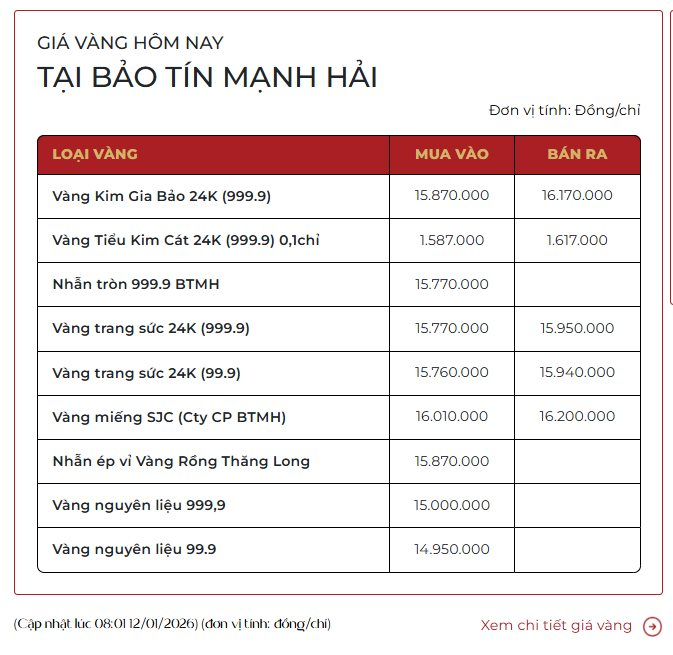 Vàng Kim gia bảo 24k của Bảo Tín Mạnh Hải được giao dịch quanh ngưỡng 158,70 triệu đồng/lượng (mua) - 161,70 triệu/lượng (bán).