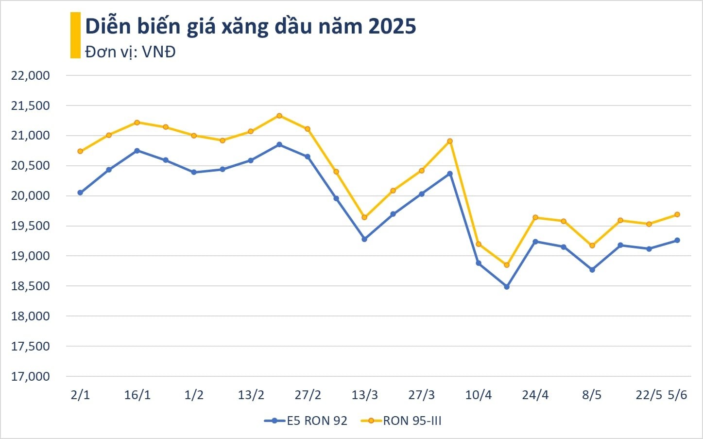 Tại kỳ điều hành gần đây nhất (ngày 29/5), giá xăng E5 RON 92 và xăng RON 95 tăng từ 33 - 74 đồng/lít. Sau điều chỉnh, giá bán lẻ tối đa với xăng E5 RON 92 là 19.196 đồng/lít và xăng RON 95 là 19.565 đồng/lít. Dầu diesel giảm 269 đồng/lít, xuống 17.136 đồng/lít.