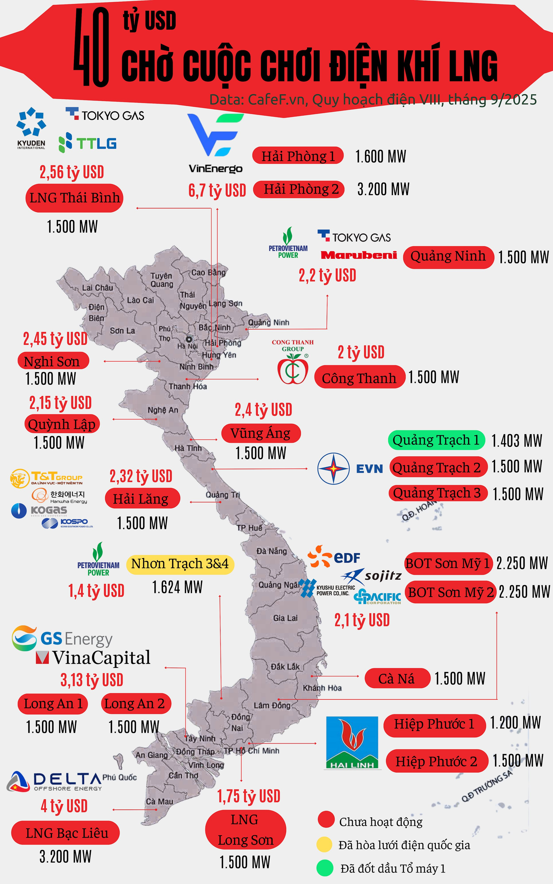 Các dự án khác như LNG Long Sơn (Bà Rịa - Vũng Tàu, 1.500 MW) hay LNG Vũng Áng III (Hà Tĩnh, 1.500 MW) vẫn đang trong giai đoạn tìm kiếm, lựa chọn chủ đầu tư.