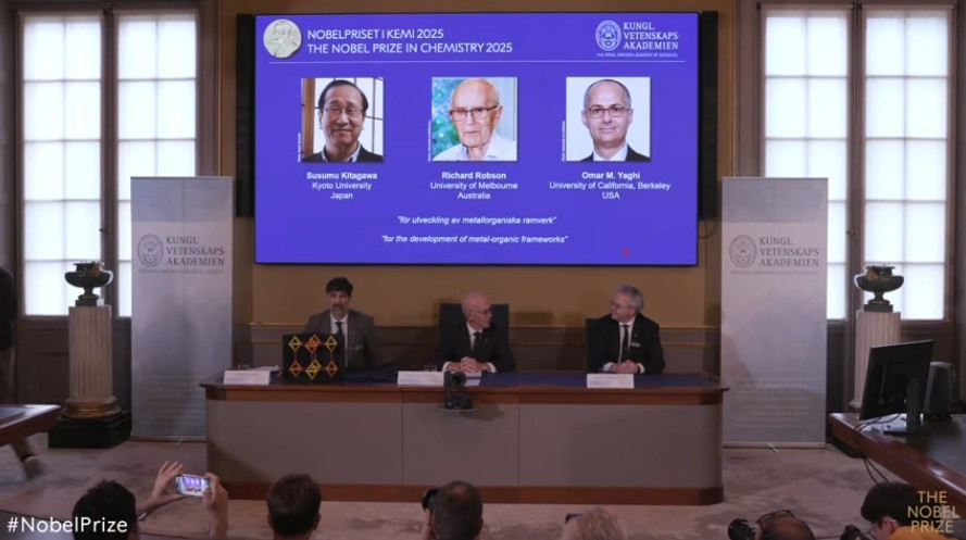 Chiều nay (8/10), Viện Hàn lâm Khoa học Hoàng gia Thụy Điển quyết định trao giải Nobel Hóa học năm 2025 cho 3 nhà khoa học của Nhật Bản, Úc và Mỹ, vì có công phát triển các khung kim loại hữu cơ.