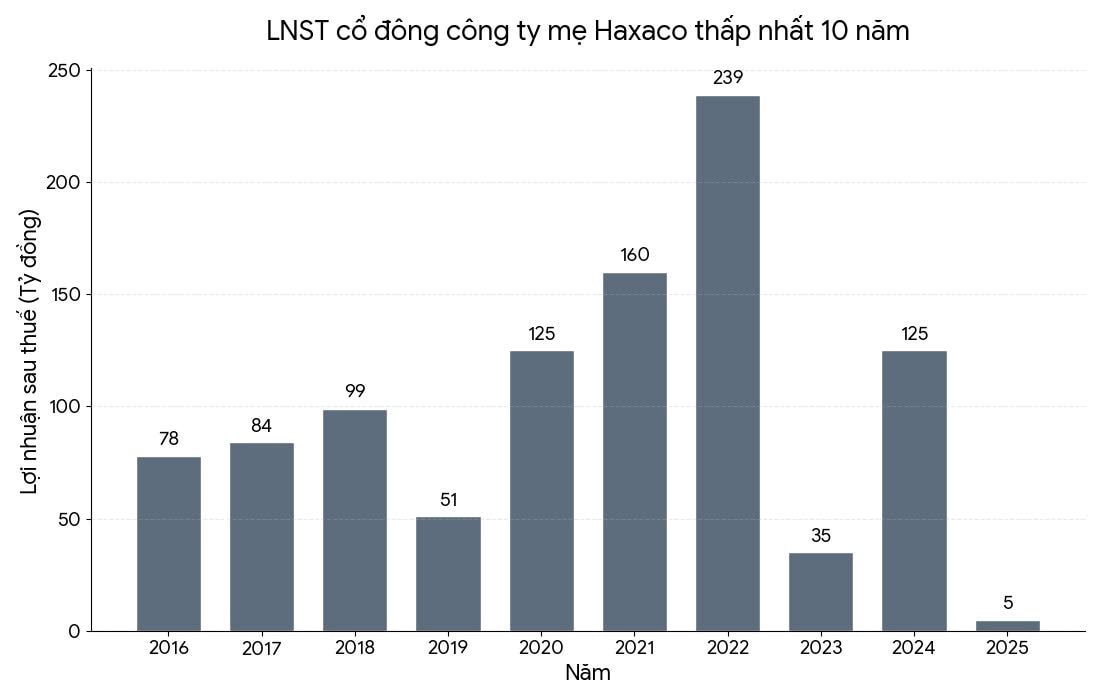 Động thái này được đưa ra khi Haxaco khép lại năm 2025 với kết quả không như kỳ vọng. Doanh nghiệp phân phối Mercedes-Benz ghi nhận lợi nhuận trước thuế 56 tỷ đồng, cách xa mục tiêu 260 tỷ đồng đề ra đầu năm. Sau thuế, lợi nhuận thuộc về cổ đông công ty mẹ chỉ hơn 5 tỷ đồng – mức thấp nhất trong vòng 10 năm.