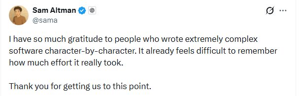 Chính giữa bối cảnh căng thẳng đó, trong một dòng tweet hôm thứ Ba mà chỉ có thể mô tả là xát muối vào vết thương, CEO OpenAI Sam Altman tuyên bố: "Tôi rất biết ơn những người đã viết phần mềm cực kỳ phức tạp từng ký tự một." Ông tiếp tục: "Giờ đã thật khó để nhớ lại việc đó từng tốn bao nhiêu công sức. Cảm ơn vì đã đưa chúng ta đến điểm này."