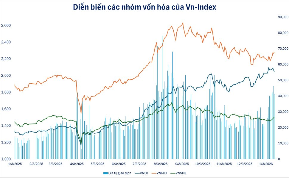 Nhìn lại trong quá khứ, VN-Index đa số đều có nhịp tăng mạnh trong với cùng bối cảnh hiện tại. Bên cạnh đó, trong tuần tới, nhiều doanh nghiệp cũng sẽ bắt đầu công bố kết quả kinh doanh quý 4/2025, cũng sẽ là yếu tố ảnh hưởng đến xu hướng chung của thị trường. Ở giai đoạn hiện tại, xu hướng thị trường vẫn chưa rõ ràng, chuyên gia Pintree khuyến nghị nhà đầu tư nên giữ vững tỷ trọng cổ phiếu và tiền mặt, đề cao quản trị danh mục và không nên FOMO vào những cổ phiếu đã tăng mạnh trong thời gian vừa qua.