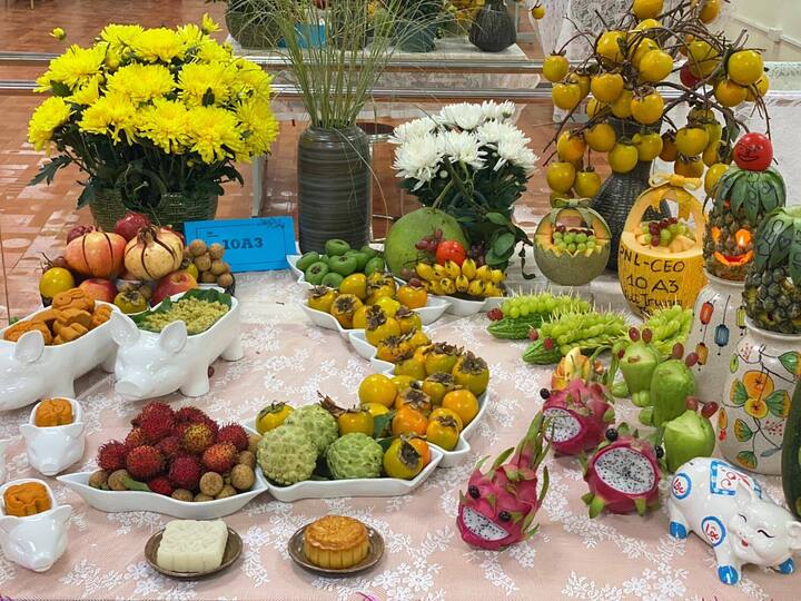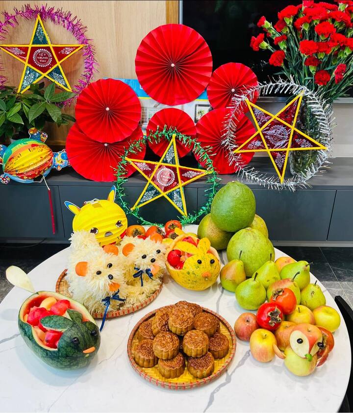 Mâm cỗ rực rỡ với hoa tươi, trái cây ngọt lành, bánh nướng, bánh dẻo đủ vị và những chú đầu lân nhỏ xinh, tượng trưng cho sự đoàn viên, ấm no. Bên cạnh là mâm quả ngũ sắc, đèn cá chép vàng bay bổng, tất cả hòa quyện tạo nên một không khí Trung thu sum vầy, rộn ràng. (Ảnh: Thu Huong Vu)