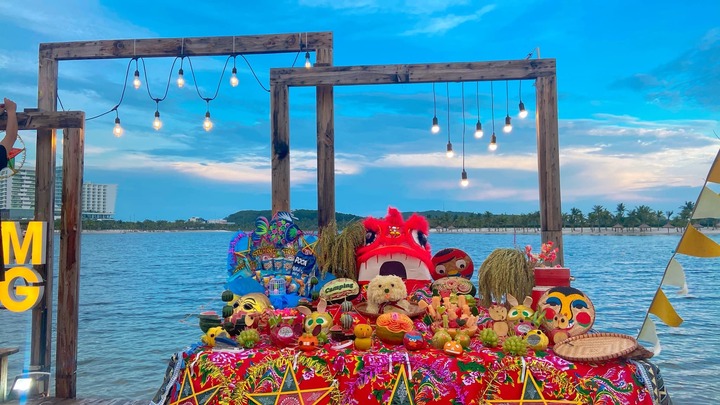 Giữa không gian biển Đồ Sơn lộng gió, mâm cỗ Trung thu được bày biện trang trọng với bánh nướng, bánh dẻo, trái cây và đèn ông sao đủ sắc màu. (Ảnh: Sữa hạt từ tâm)