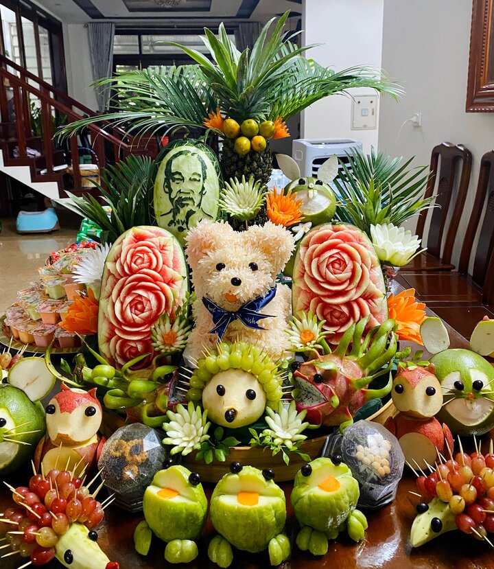 Mâm cỗ Trung thu trở nên sống động hơn nhờ những loại trái cây được cắt tỉa cầu kỳ, khéo léo tạo thành đủ hình thù ngộ nghĩnh như chú chó bằng quả bưởi, chú gấu đáng yêu kết bằng chùm nho. Sự sáng tạo ấy không chỉ khiến mâm cỗ thêm rực rỡ, bắt mắt mà còn mang lại niềm vui, sự háo hức cho các em nhỏ trong đêm trăng rằm. (Ảnh: Phạm Thu Huyền)