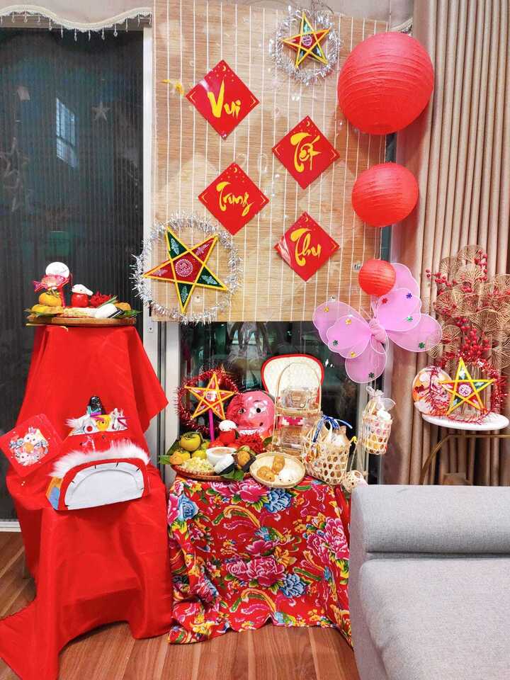 Mâm cỗ trông trăng này có chó bưởi, giỏ dưa, cùng ngôi sao đèn lồng được trang trí đơn giản mà đẹp.