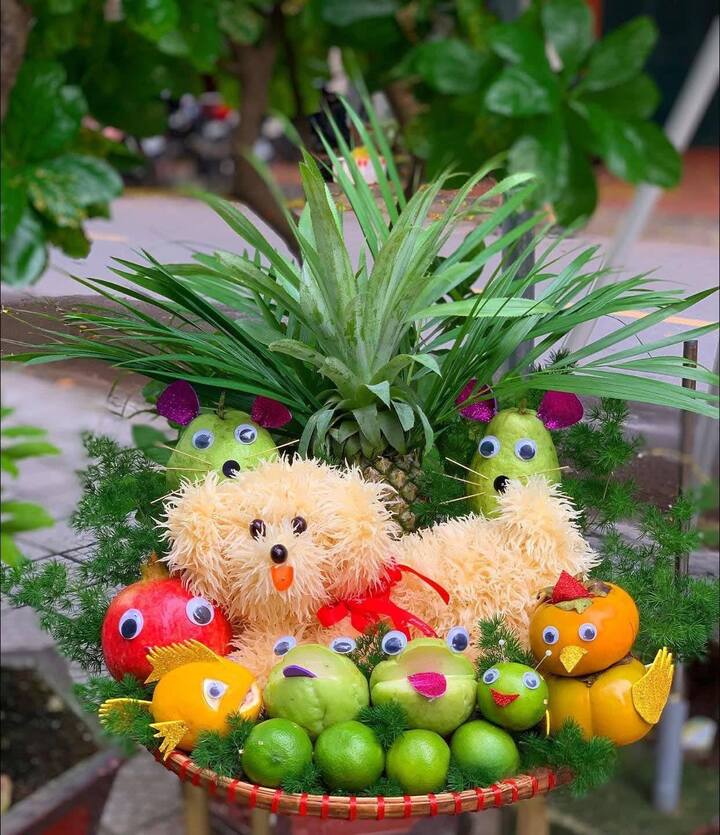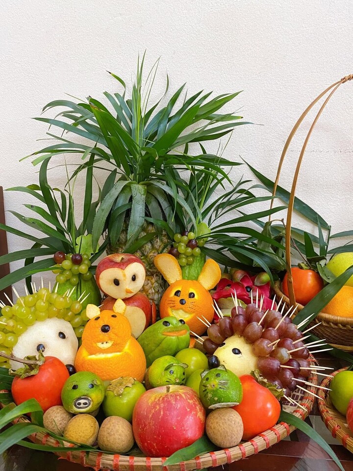 Mâm cỗ Trung Thu đơn giản hơn với chó bưởi, các loại trái cây được cắt tỉa hình thú. (Ảnh: Thu Huong Vu)