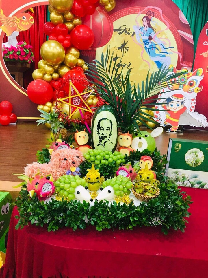 Mâm cỗ Trung thu được các cô giáo chuẩn bị tại lớp học, với điểm nhấn là quả dưa hấu khắc chân dung Bác Hồ đầy thân thương mà trang trọng, kết hợp cùng nhiều loại trái cây khác. (Ảnh: Thu Huong Vu)