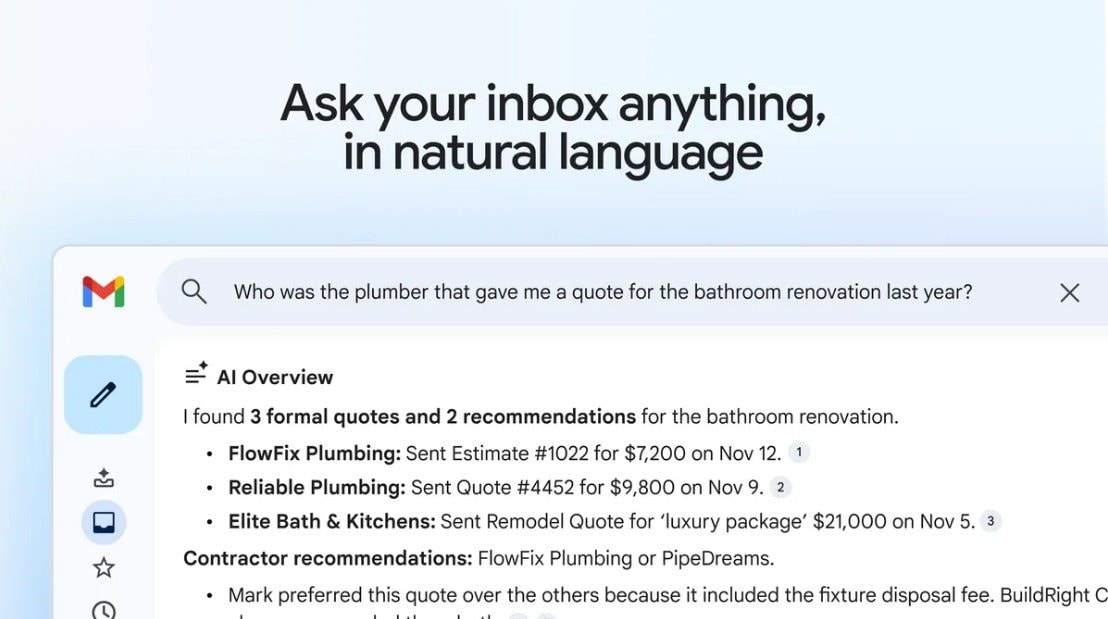 - AI Overviews để tìm kiếm email: Trước đây, mọi người có thể tìm kiếm email bằng cách nhập các từ khóa như “thợ sửa ống nước” vào thanh tìm kiếm. Giờ đây, người dùng có thể nhập một câu hỏi vào thanh tìm kiếm, chẳng hạn như “Tên của người thợ sửa ống nước đã sửa bồn cầu cho tôi năm ngoái là gì?”. Tính năng này sẽ đặc biệt tiện dụng cho những người có hộp thư quá tải, vì cách tìm kiếm từ khóa “thợ sửa ống nước” kiểu cũ có thể hiện ra rất nhiều email không liên quan.