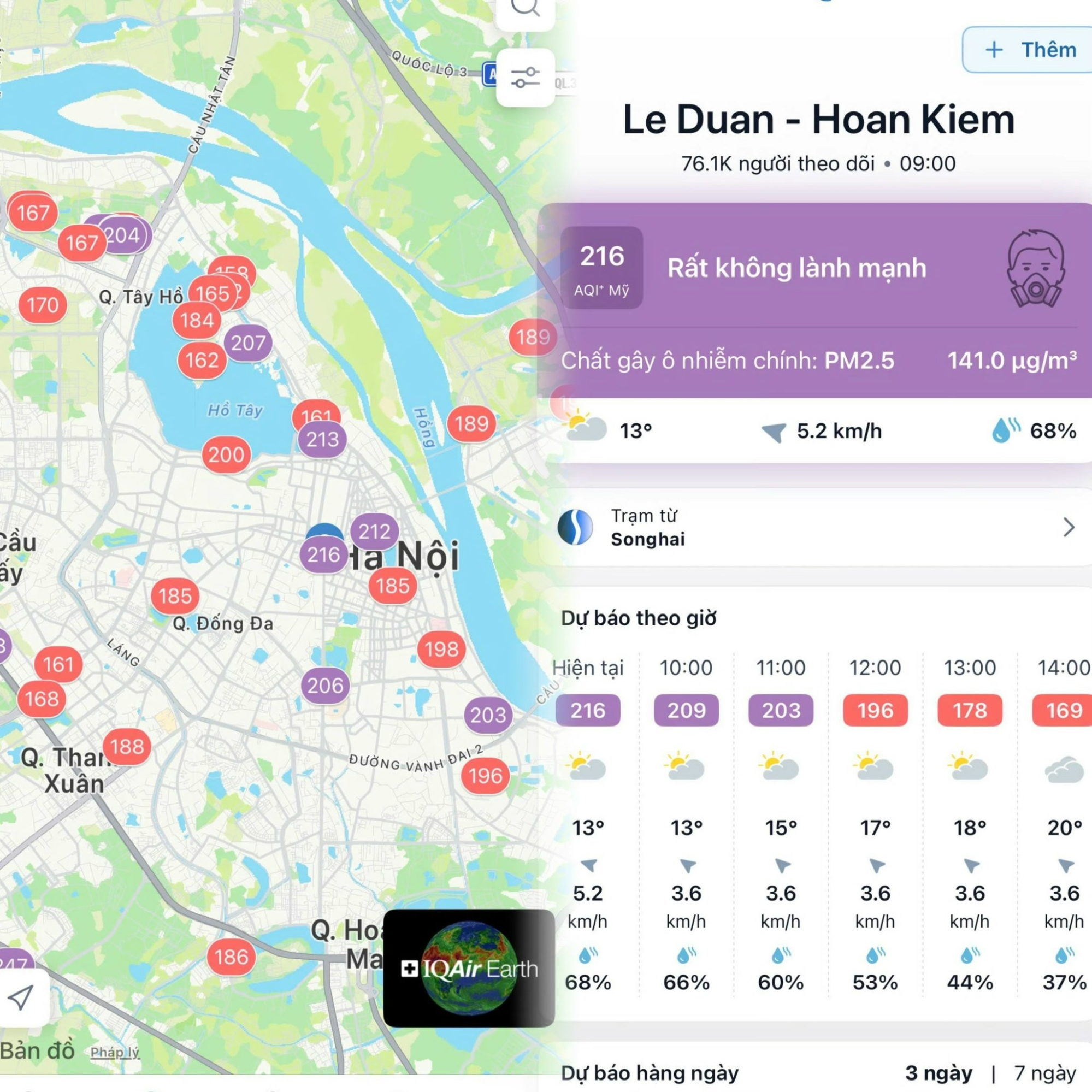 Đáng chú ý, thông qua theo dõi số liệu từ ứng dụng AirVisual/PAM Air, nhiều trạm quan trắc tại các quận trung tâm Hà Nội như Đống Đa, Hoàn Kiếm, Hai Bà Trưng, Thanh Xuân ghi nhận chỉ số AQI vượt ngưỡng 200 trong một số thời điểm. Mức độ này được xếp vào nhóm "rất không tốt", đồng nghĩa với việc mọi nhóm dân cư, kể cả người khỏe mạnh, đều có nguy cơ bị ảnh hưởng nếu tiếp xúc ngoài trời kéo dài.
