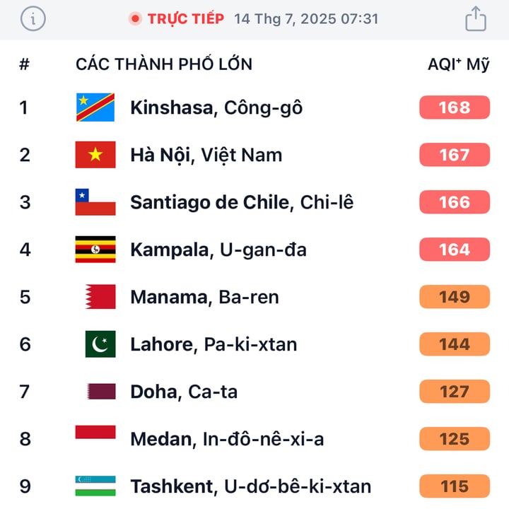 Sáng 14/7, Hà Nội đứng thứ 2 thế giới về mức độ ô nhiễm không khí với chỉ số AQI 167, nhiều khu vực chạm ngưỡng đỏ nguy hại, gây ảnh hưởng nghiêm trọng đến sức khỏe.