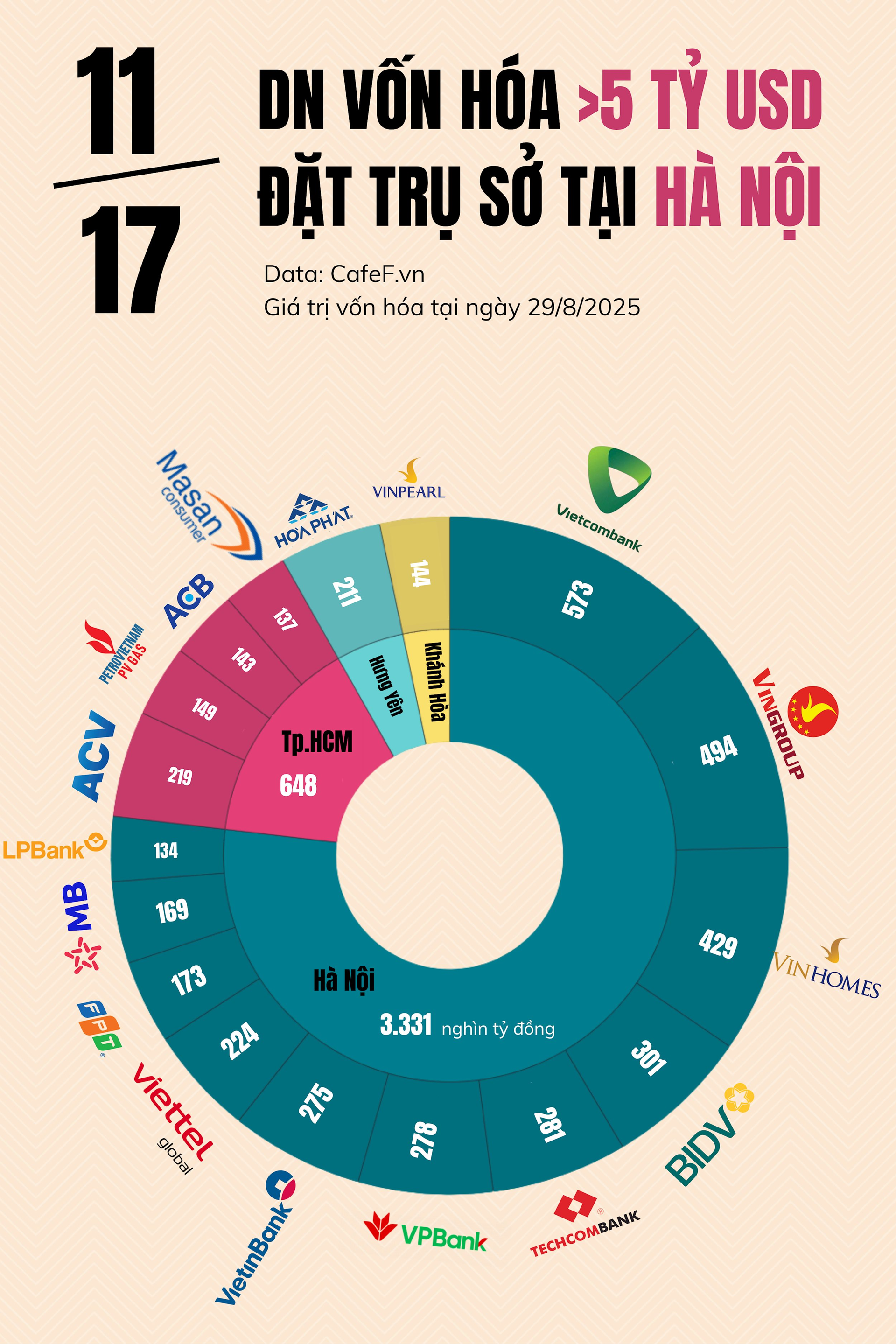 Tính đến ngày 29/8/2025, thị trường chứng khoán Việt Nam có 17 doanh nghiệp đạt giá trị vốn hóa trên 5 tỷ USD (theo tỷ giá 1 USD = 26.000 VND).