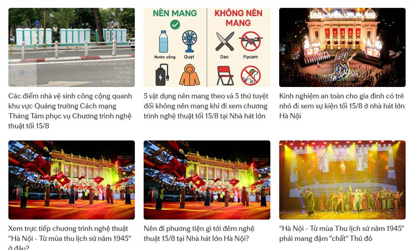 Hà Nội đang hân hoan chào đón một đêm nghệ thuật đặc biệt – “Hà Nội - Từ mùa thu lịch sử năm 1945”, diễn ra vào lúc 20h tối thứ Sáu, ngày 15/8/2025 tại Quảng trường Cách mạng Tháng Tám, trước Nhà hát Lớn. Đây là chương trình cấp thành phố, quy tụ đông đảo nghệ sĩ như NSƯT Xuân Hinh, NSND Hoàng Anh Tú, ca sĩ Khánh Linh, ca sĩ Hoàng Hải, nhóm Oplus... cùng các đơn vị nghệ thuật chuyên nghiệp, được truyền hình trực tiếp trên VTV1 để phục vụ khán giả cả nước.