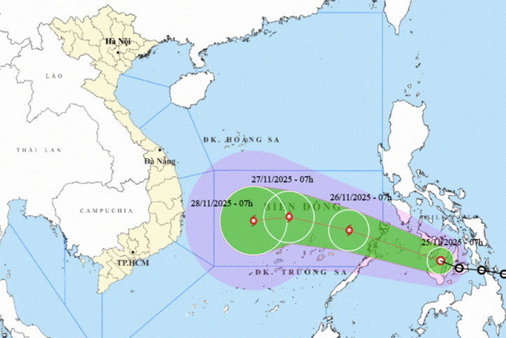 Trung tâm Dự báo khí tượng thuỷ văn quốc gia cho hay, lúc 7h ngày 25/11, vị trí tâm áp thấp nhiệt đới ở vào khoảng 10,3 độ Vĩ Bắc; 123,1 độ Kinh Đông, trên khu vực miền Trung Philippines. Sức gió mạnh nhất vùng gần tâm áp thấp nhiệt đới mạnh cấp 7 (50-61km/giờ), giật cấp 9, di chuyển theo hướng Tây Tây Bắc với tốc độ 20-25km/h.