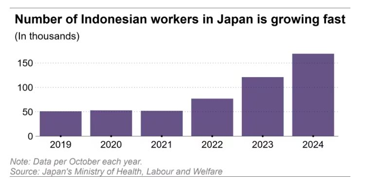 Số lượng người Indonesia sống tại Nhật Bản với thị thực lao động có tay nghề cụ thể đã đạt 53.000 người vào năm 2024, tăng từ 44.000 người của năm trước. Tính đến tháng 7, đã có thêm 10.181 người đến quốc gia Đông Á này trong năm nay.