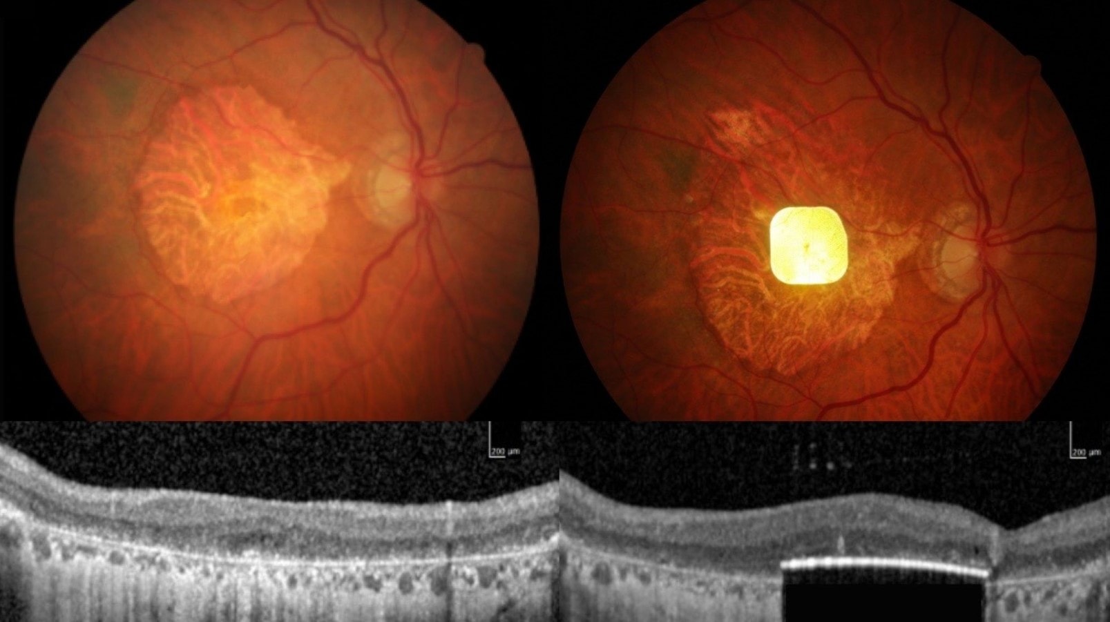 Mắt trước (trái) và sau (phải) khi cấy chip vào dưới võng mạc - Ảnh: Moorfields Eye Hospital