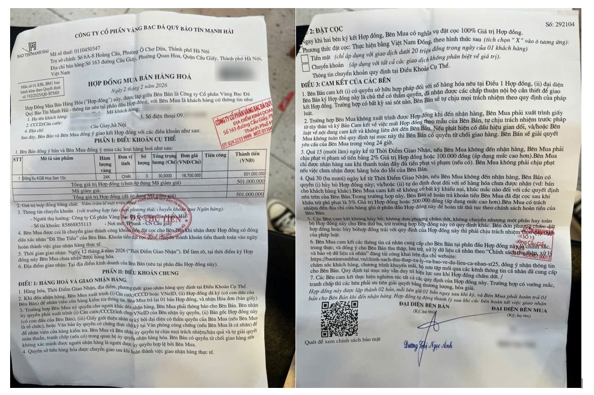 Theo thông tin do một khách hàng cung cấp, việc mua vàng tại Bảo Tín Mạnh Hải được ghi nhận thông qua Hợp đồng mua bán hàng hóa, trong đó người mua trả 100% tiền mua vàng (thông qua hình thức đặt cọc) nhưng không được nhận vàng ngay mà phải hơn 2 tháng sau mới đến thời điểm nhận vàng.