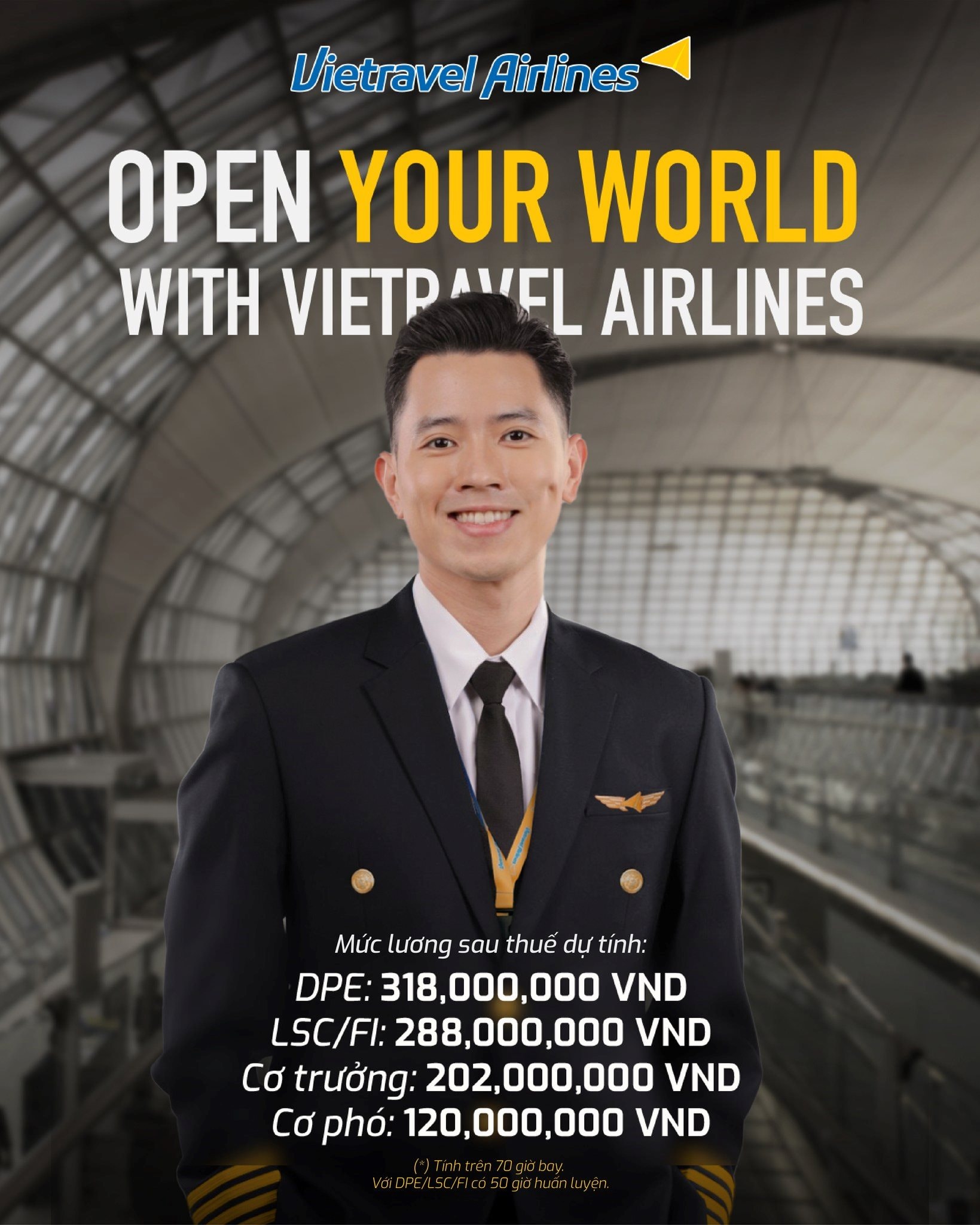 Đối với vị trí cơ trưởng và cơ phó, mức lương lần lượt là 202 triệu đồng và 120 triệu đồng/tháng. Vị trí này cũng cần đạt được 70 giờ bay/tháng.
