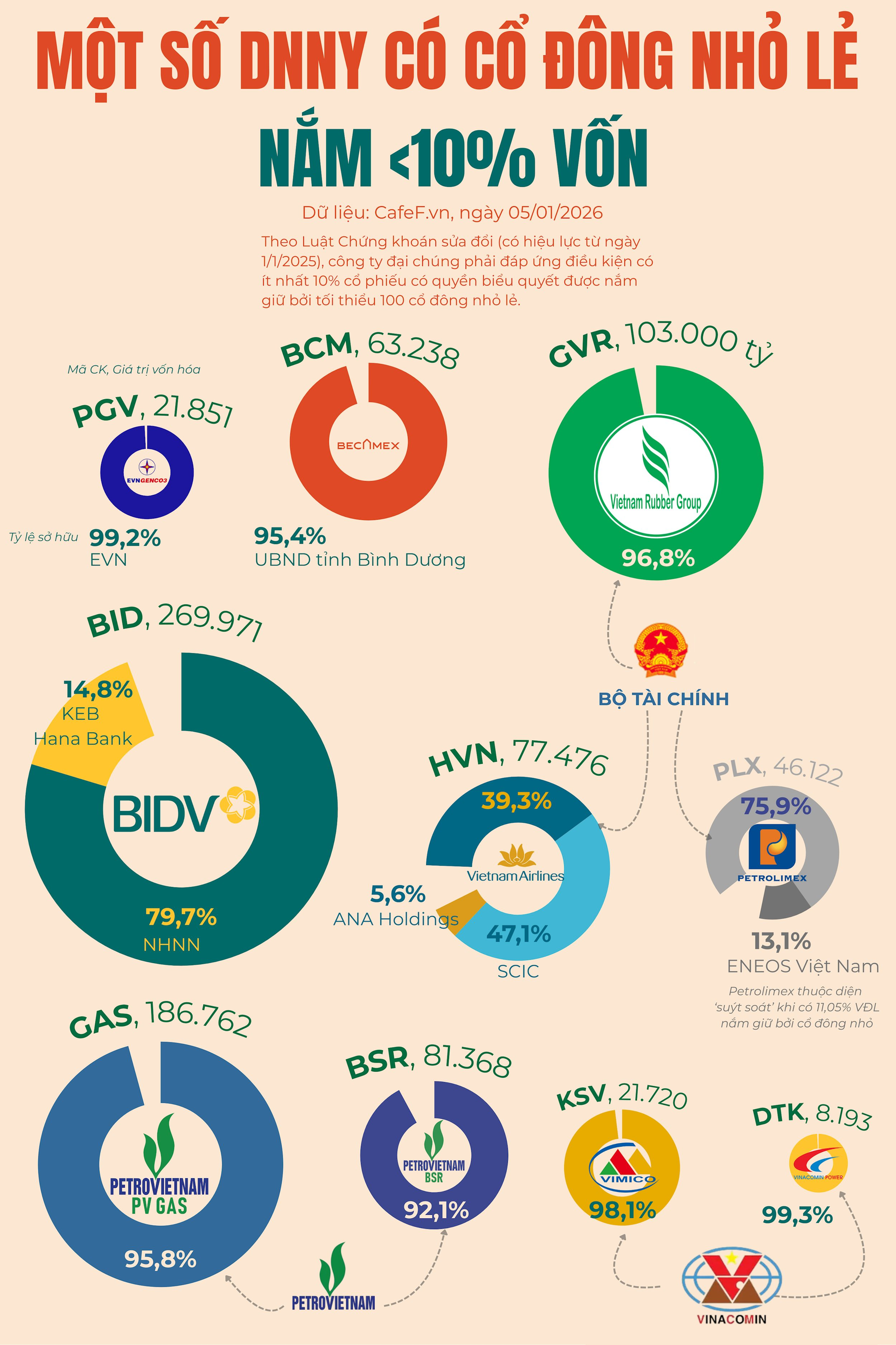 Không chỉ riêng PV GAS hay VIMICO, thống kê cho thấy thị trường chứng khoán Việt Nam còn nhiều doanh nghiệp lớn mà tỷ lệ sở hữu của cổ đông nhỏ lẻ chưa đạt mức tối thiểu 10%. Trong đó có nhiều doanh nghiệp có vốn hóa trên 1 tỷ USD, phần lớn là các doanh nghiệp Nhà nước cổ phần hóa nhưng Nhà nước vẫn nắm quyền chi phối.