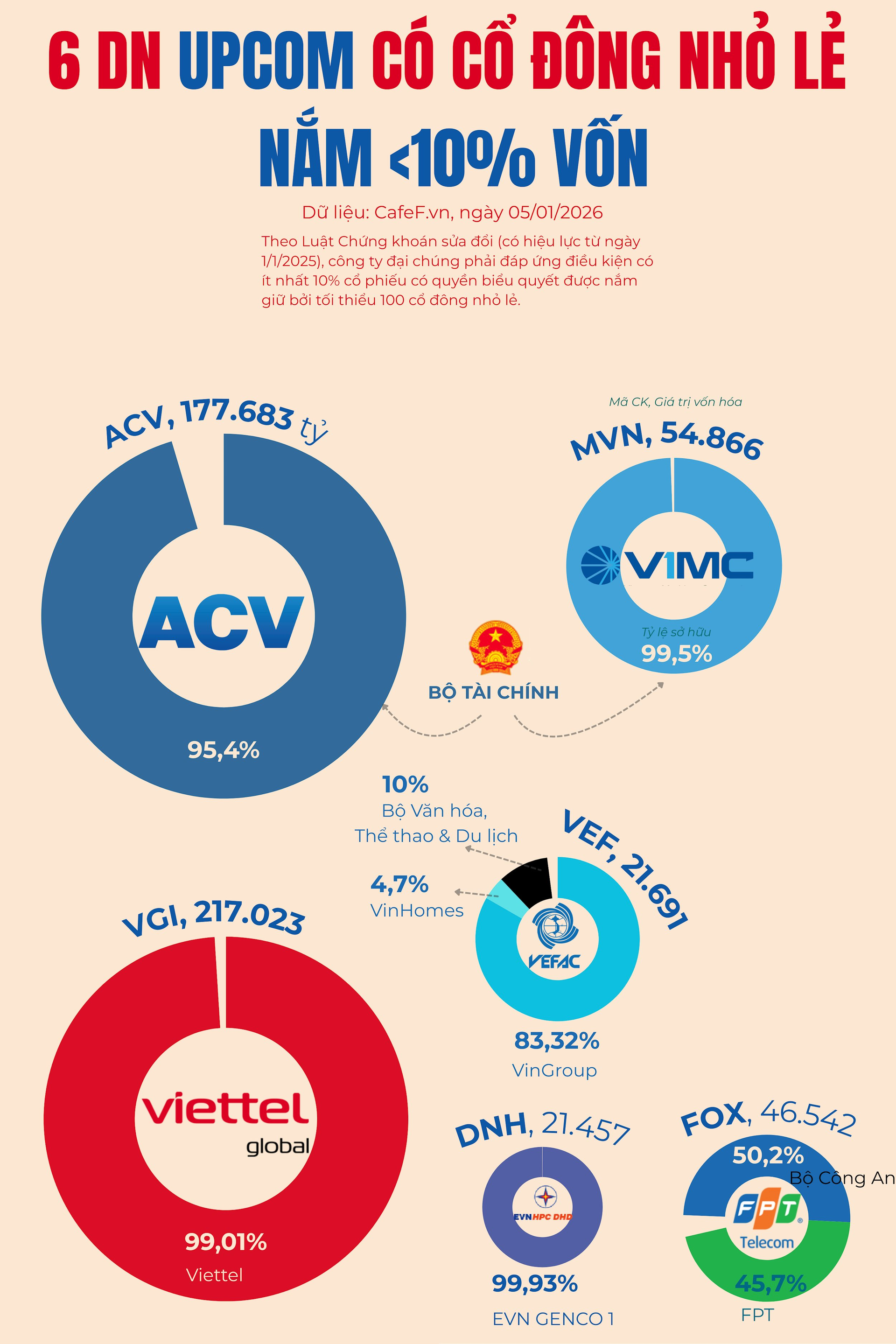 Tại sàn Upcom, các gương mặt đình đám ở tình trạng này, gồm Tổng công ty Cảng hàng không Việt Nam ACV do Bộ Tài chính nắm 95,4%, Viettel Global (VGI) do Tập đoàn Viettel nắm tới 99,01%, Tổng công ty hàng hải Việt Nam – CTCP (do Bộ Tài chính nắm 99,5%), FPT Telecom (do Bộ Công an nắm 50,2%, FPT nắm 45,7%) hay CTCP Trung tâm hội chợ triển lãm Việt Nam (do Vingroup nắm 83,32%, Bộ Văn hóa, Thể thao và Du lịch nắm 10% và VinHomes nắm 4,7%)…