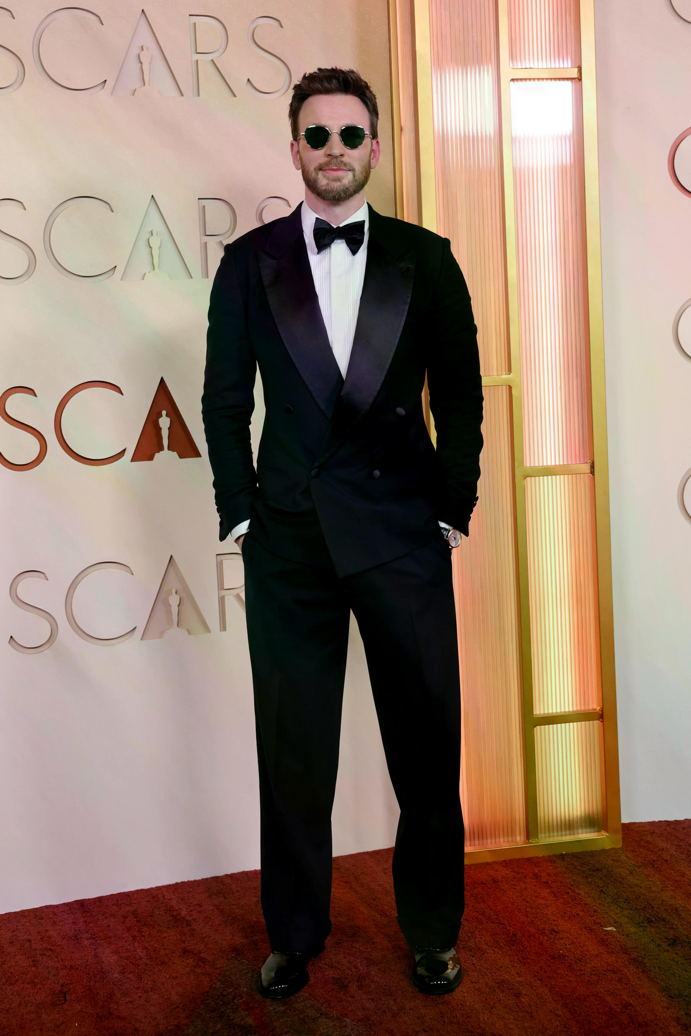 Chris Evans xuất hiện trong bộ tuxedo đen hai hàng khuy của Giorgio Armani. Nam diễn viên kết hợp kính râm tròn và nơ đen, tạo phong cách vừa cổ điển và mang lại vẻ lịch lãm, đậm chất quý ông Hollywood.