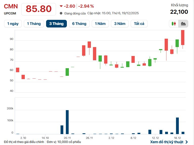 Trước đó, ngay sau khi thông tin đấu giá được công bố, CMN đã bước vào nhịp tăng mạnh với 3 phiên tăng trần liên tiếp từ ngày 20/11. Tính đến ngày 19/12, cổ phiếu này đã tăng hơn 60% chỉ trong vòng một tháng.