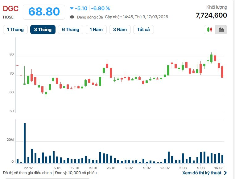 Sau thông tin ông Huyền bị khởi tố, cổ phiếu DGC ngay lập tức giảm sàn. Kết phiên 17/3 ở mức 68.800 đồng/cổ phiếu.