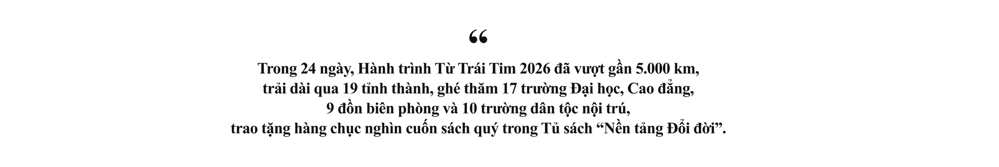 Gần 5.000km qua 19 tỉnh thành trong 24 ngày, ghé thăm 17 trường Đại học, Cao đẳng, 9 đồn biên phòng, 10 trường dân tộc nội trú, trao đi hàng chục ngàn cuốn sách quý trong Tủ sách “Nền tảng Đổi đời”. Đó là những dấu ấn rất đáng tự hào của Hành trình Từ Trái Tim 2026.