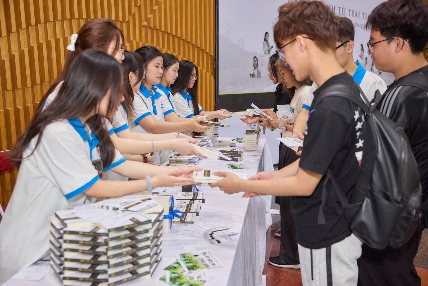 Không khí sôi nổi tại khu vực ký tặng sách, nơi sinh viên chờ gặp gỡ và giao lưu cùng các khách mời của Hành trình.