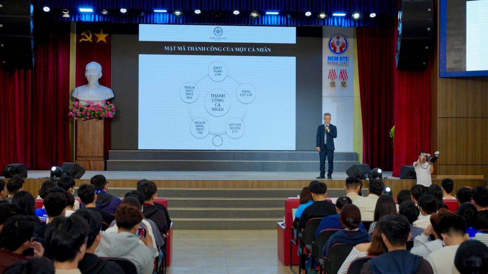PGS. Tiến sĩ Trần Hữu Đức - Giám đốc Đào tạo Tập đoàn Trung Nguyên Legend chia sẻ “Mật mã thành công” từ Hành trình Từ Trái Tim gửi đến các bạn sinh viên tại sự kiện
