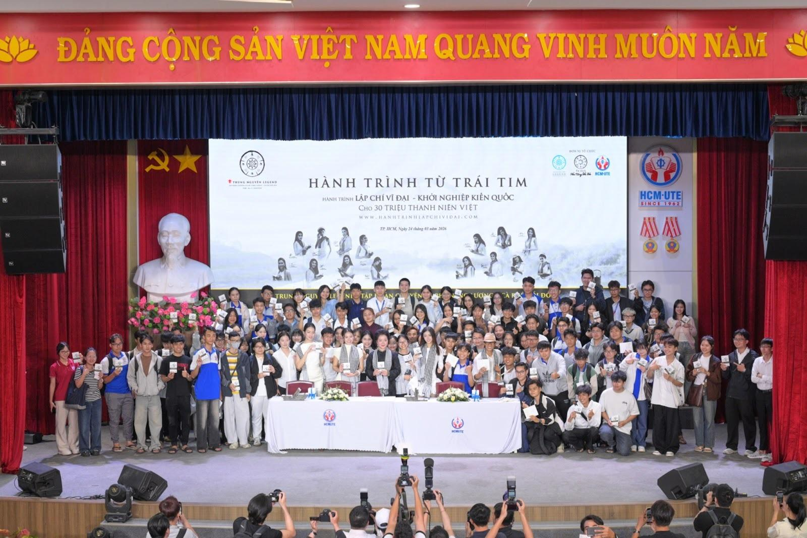 Trong ngày 24/3, “Hành trình Từ Trái Tim” tiếp tục diễn ra tại Trường Đại học Công nghệ Kỹ thuật TP.HCM và Trường Đại học Công Thương TP.HCM, với sự tham gia của đông đảo sinh viên cùng nhiều khách mời đến từ các lĩnh vực giáo dục, nghệ thuật và sáng tạo. Chương trình có sự góp mặt của cô Võ Thị Xuân Trang - Hiệu trưởng John Robert Powers Việt Nam, Hoa hậu Hoàn Vũ Việt Nam 2025 Phương Linh, Hoa hậu Du lịch Việt Nam Toàn cầu 2024 Võ Cao Kỳ Duyên, Nhà thiết kế - Họa sĩ Phan Anh Thư, nghệ sĩ Izara Thiên Nga và ca sĩ Phạm Anh Khoa, dưới sự dẫn dắt của PGS. Tiến sĩ Trần Hữu Đức - Giám đốc Đào tạo Tập đoàn Trung Nguyên Legend.