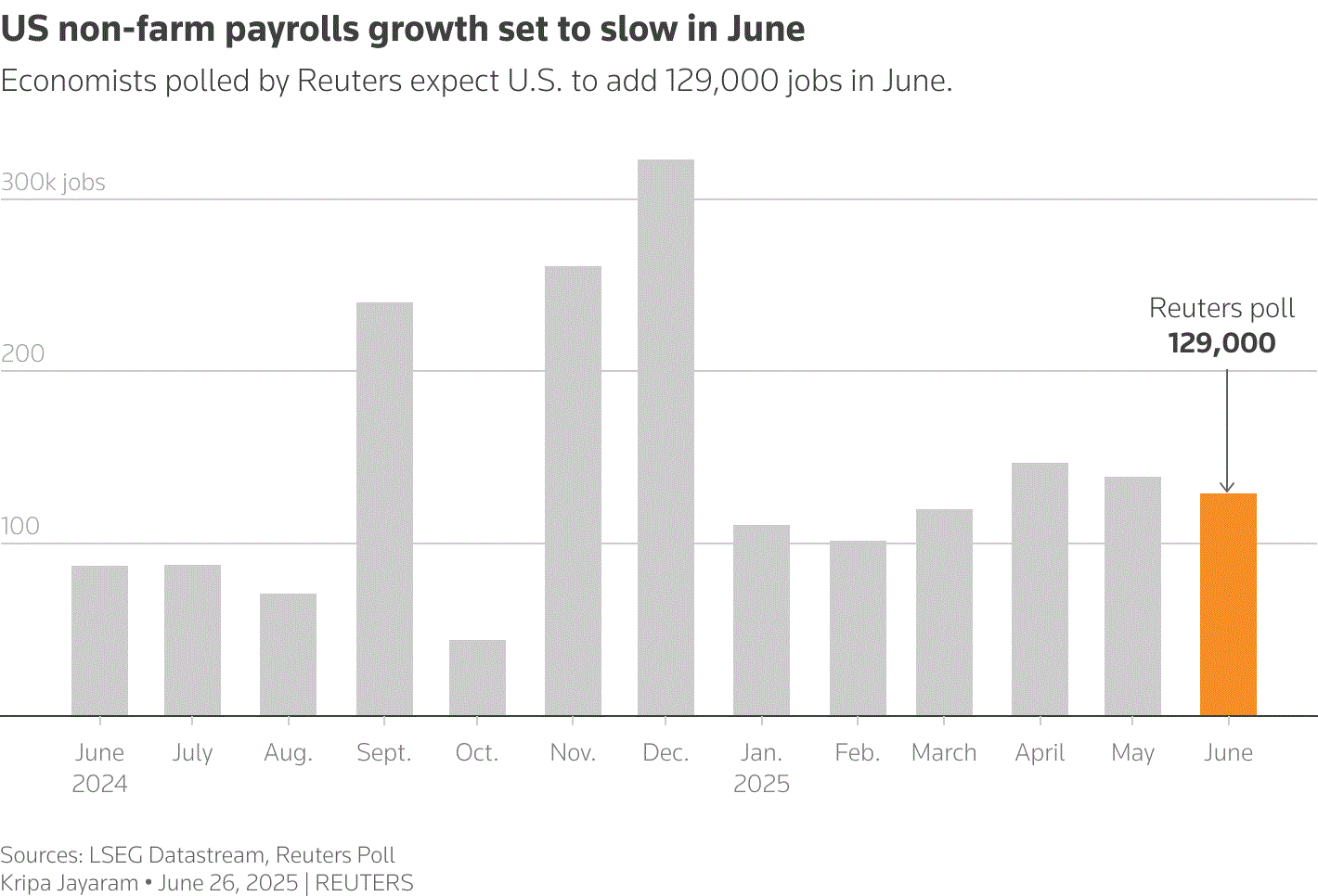 Dữ liệu bảng lương của Mỹ trong tháng 6/225, dự kiến công bố vào ngày 3/7/2025, trong tuần lễ nghỉ lễ Quốc khánh Mỹ, dự kiến sẽ cho thấy thị trường đã tạo thêm 129.000 việc làm, theo một cuộc thăm dò của Reuters. Tốc độ tăng trưởng này chậm hơn một chút so với mức tăng 139.000 việc của tháng 5/2025.