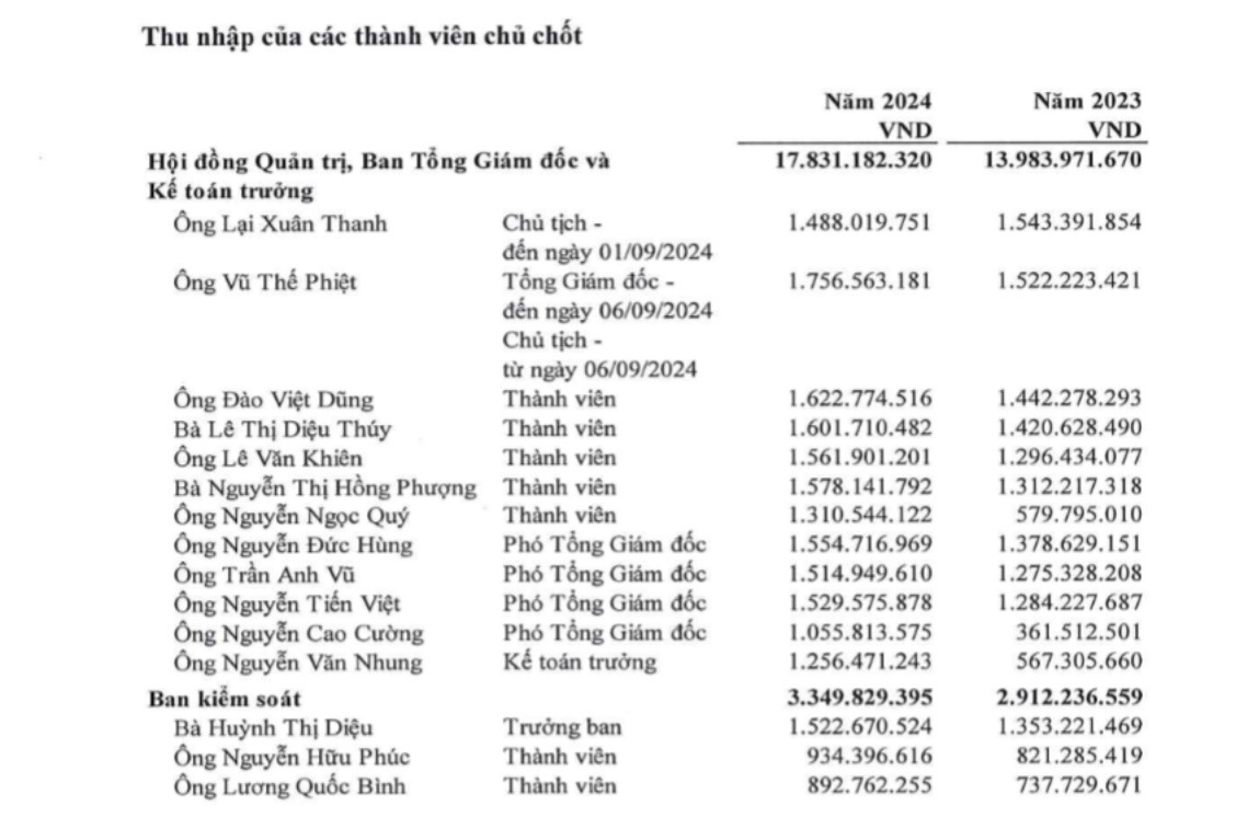 Tổng thu nhập của HĐQT, Ban Tổng Giám đốc và Kế toán trưởng trong năm 2024 đạt khoảng 17,83 tỷ đồng, tăng so với 13,98 tỷ đồng của năm 2023.