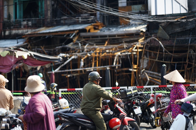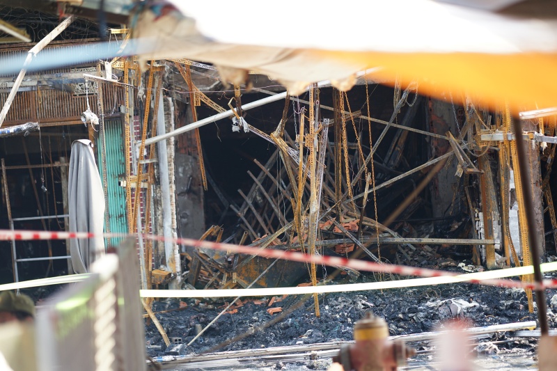 Nhiều kệ hàng bằng sắt bị biến dạng, đổ sập, các bao bạt, thùng carton, giày dép cháy thành than. Một số bức tường nứt vỡ, bong tróc lớp vữa, nhiều mảng tôn bị sức nóng làm xoắn lại. Lối đi trong chợ ám khói đen, nước chữa cháy đọng thành vũng, hòa lẫn tro than và rác cháy.